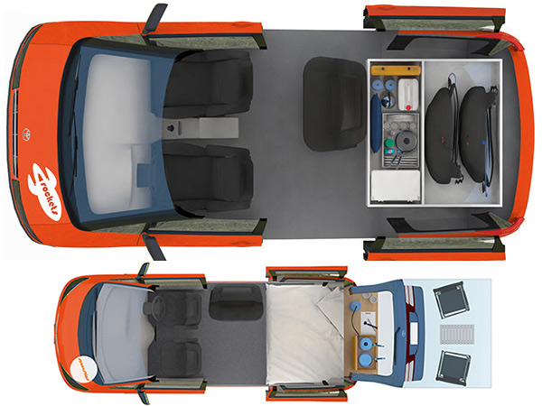 Separater Stauraum im hinteren Teil in den 2 große Rucksäcke oder Taschen passen |